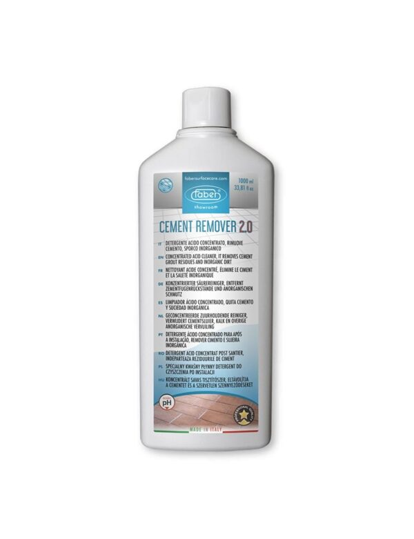 CEMENT REMOVER 2.0 is a concentrated acid cleaner formulated for post-installation cleaning of floors and coverings grouted with cementitious materials. It is designed to effectively remove cement residues, inorganic dirt and salt efflorescence, restoring surfaces after installation and heavy construction work.